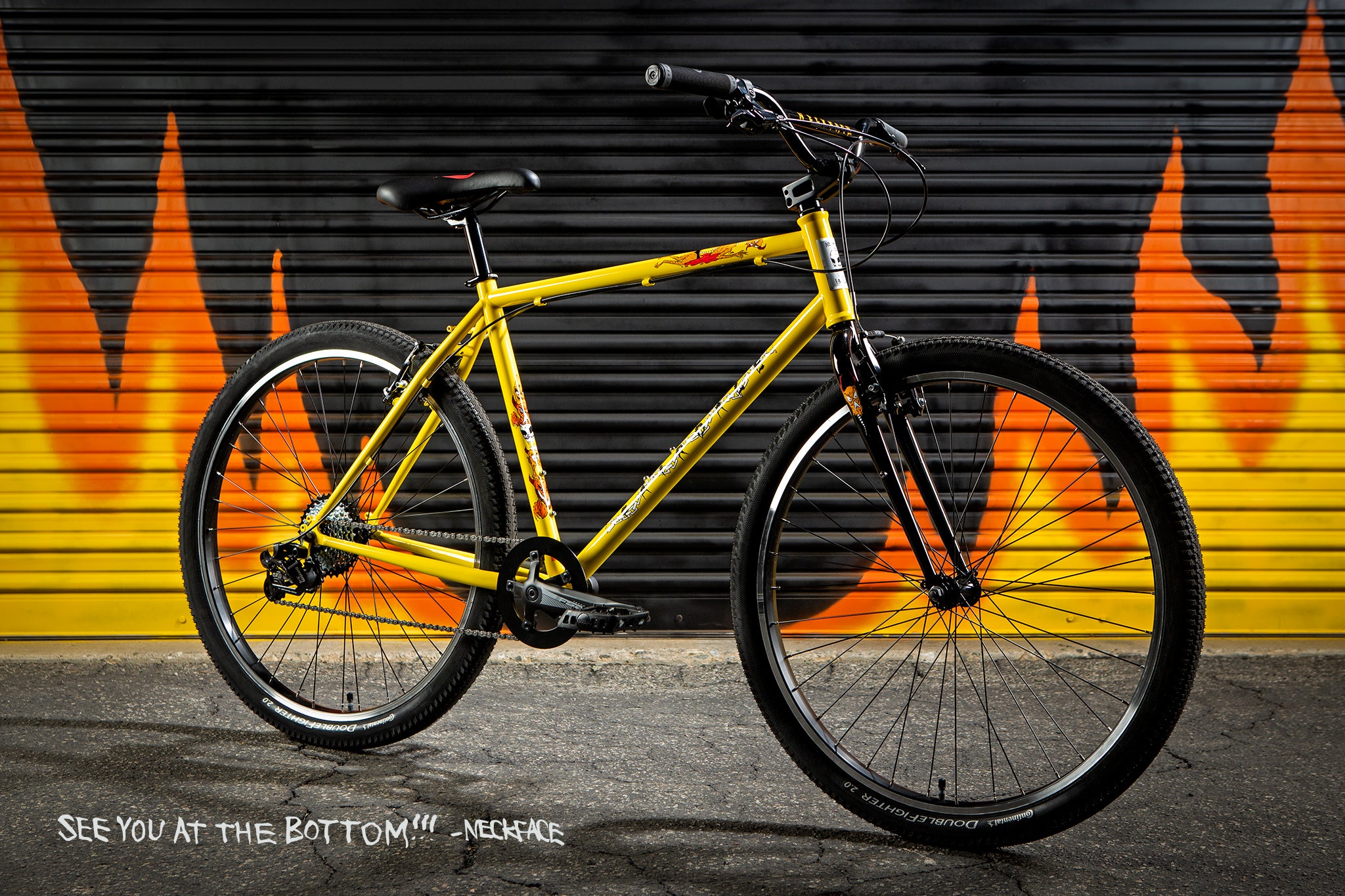 Being a Fairdale owner himself, collaborating with this world-renowned artist was a no brainer. In the end, Neckface chose our Flyer model and gave it the Neckface makeover, complete with all new artwork and decals over a classic yellow with black bars and forks. Believe it or not, this is the first yellow Fairdale we’ve ever done.