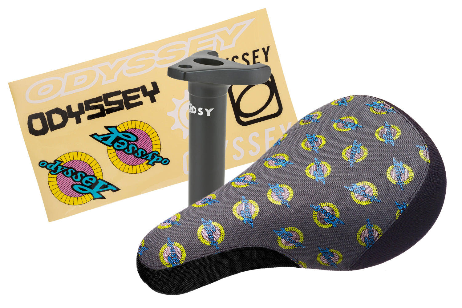 If you're a fan of the Tripod system and Odyssey nostalgia, you're in luck! We've put together this Retro combo of existing product in our warehouse. 80's logo seat, Tripod post and retro sticker sheet. Grab one while you can!